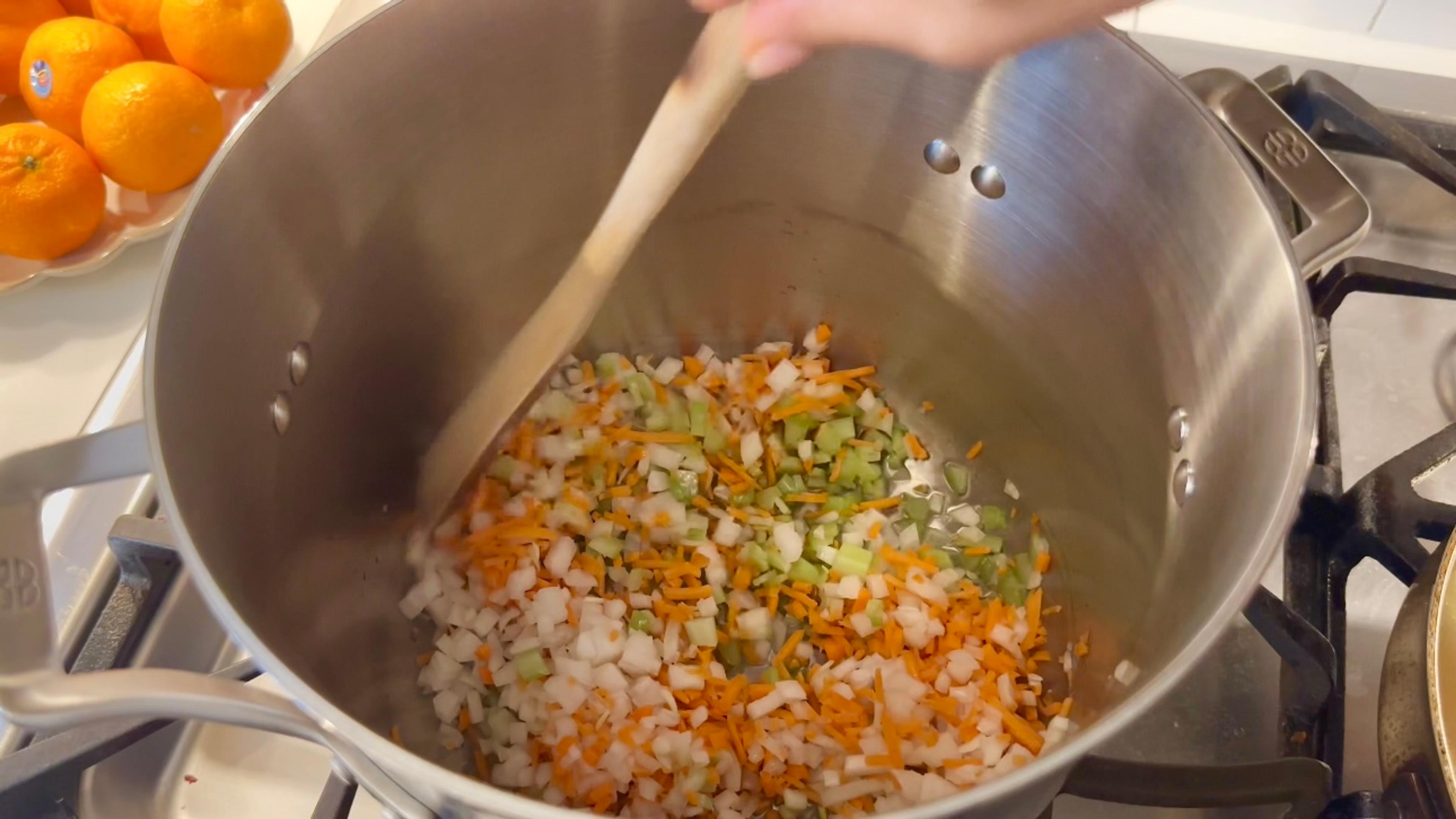 Over medium-low heat, sauté onion, carrots and celery in olive oil until soft. Add garlic and cook 30 seconds.