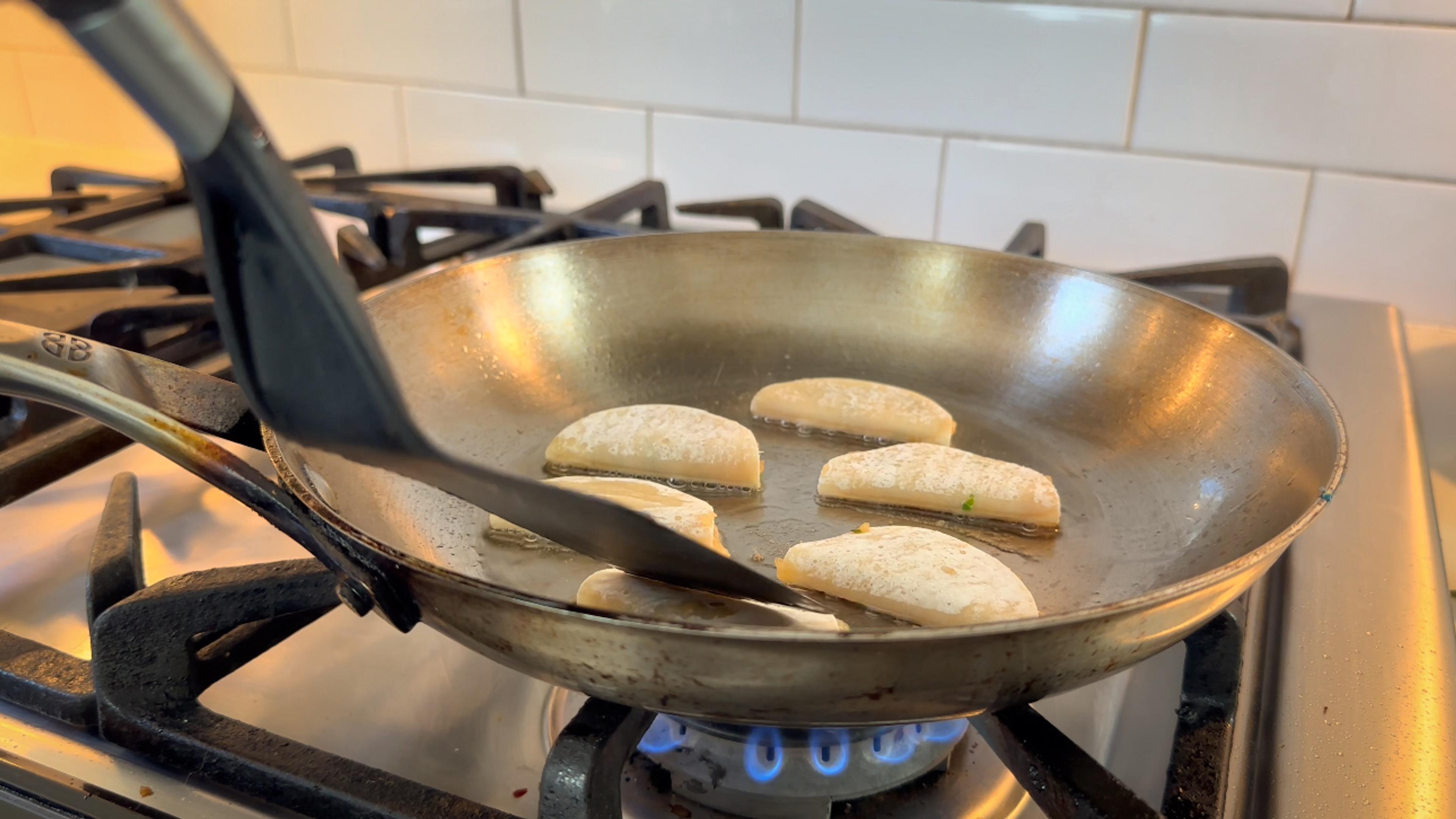 Coat a large pan over medium heat with oil until the oil shimmers. Work in batches and add the dumplings to the pan. Cook until the bottoms are crispy, about 2 minutes. Flip and cook until the wrappers crisp up, about 1 minute.